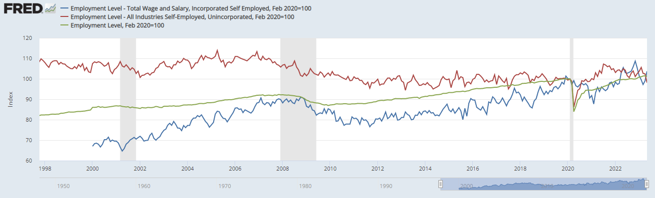 1. **Employment Level - Total Wage and Salary, Incorporated Self Employed:** This index measures the employment level for individuals who are self-employed and have incorporated their businesses. They are often considered small business owners. The reference point is February 2020, with the employment level at that time represented as 100.